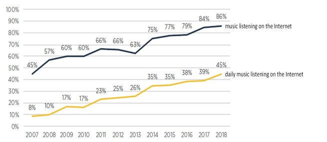 Figure 2: Music listening on the Internet in Sweden, 2007-2018